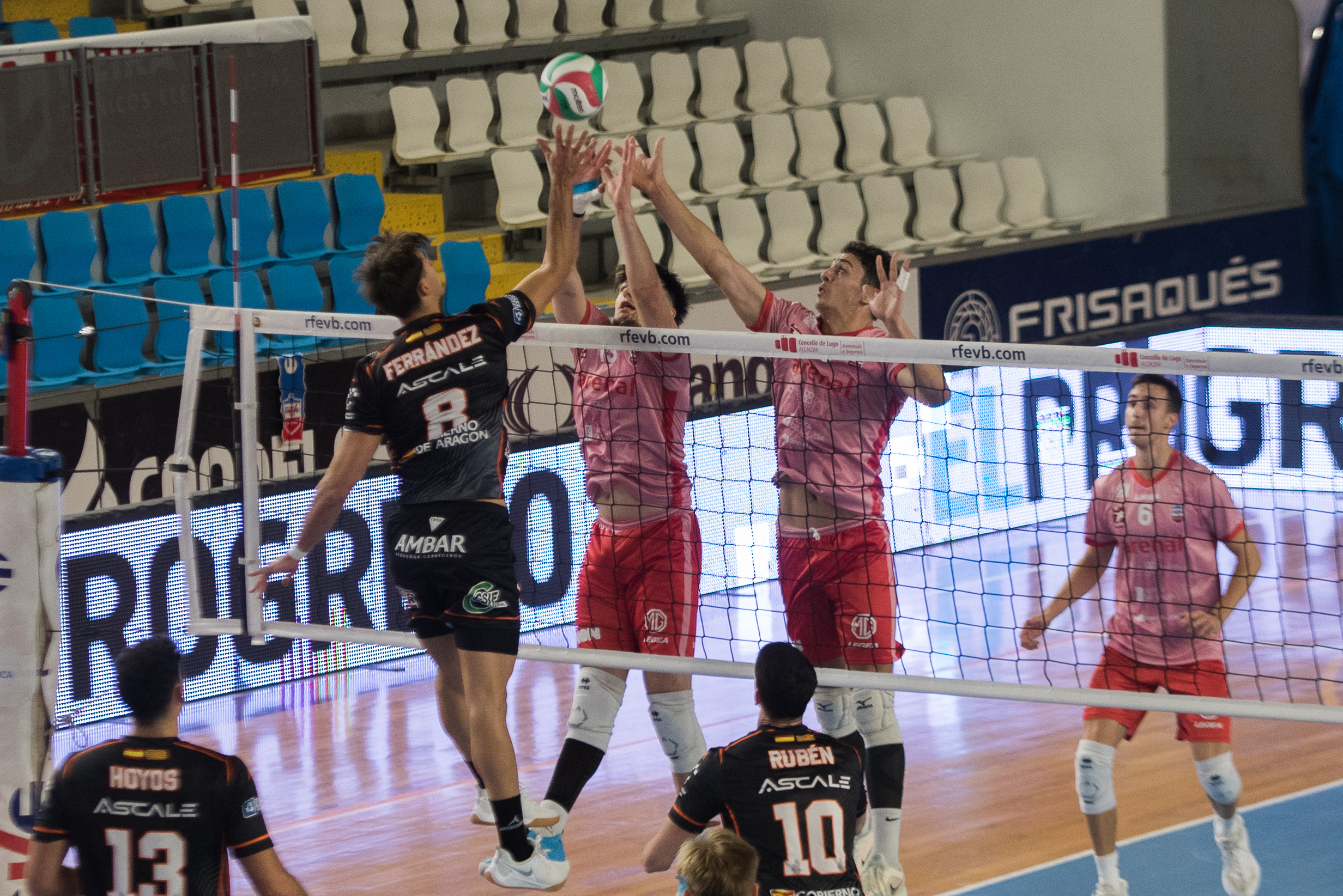 Pamesa Teruel Voleibol sumó su primera victoria lejos de Los Planos en su visita a Arenal Emevé y se afianza en la zona media de la tabla. Los turolenses controlaron el encuentro desde la red, con un sólido bloqueo que maniató los intentos ofensivos de los gallegos. David López construía un muro que los ataques de Hugo López no pudieron sortear. La pegada de Petar Hristokov refrendaron la superioridad naranja en la pista lucense para enlazar su segundo triunfo consecutivo.