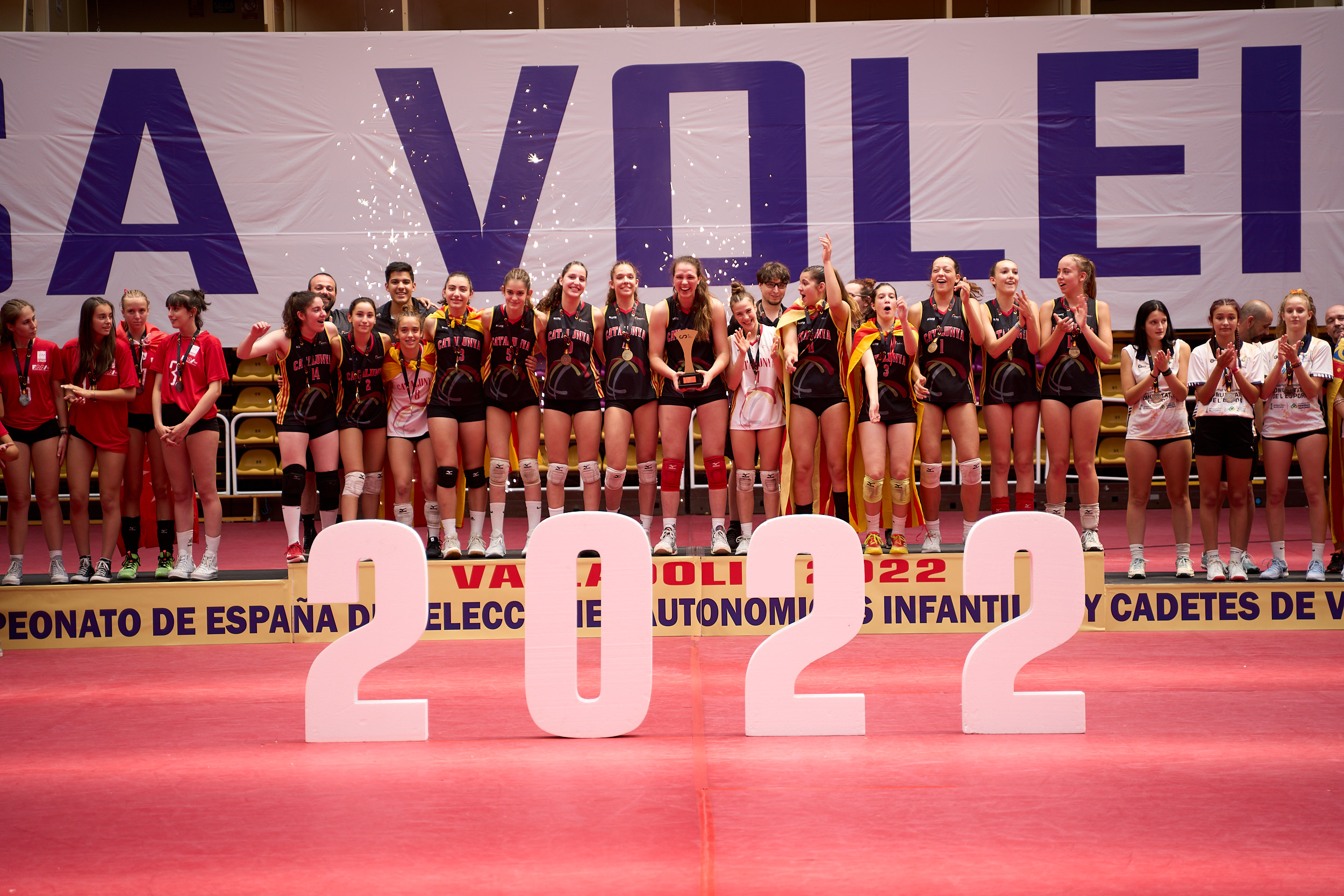 Cataluña logró el doblete en categorías femeninas al vencer en la competición Cadete Femenina a Madrid en un vibrante encuentro resuelto por 3-1 (25-13/12-25/27-25/25-22) en el marcador. La igualdad fue máxima en los tres primeros sets y sólo pudo ser rota en el agónico desenlace del tercero, más allá del punto 25. Cataluña aprovechó la dinámica para controlar el cuarto y evitar que las madrileñas forzasen el tiebreak.