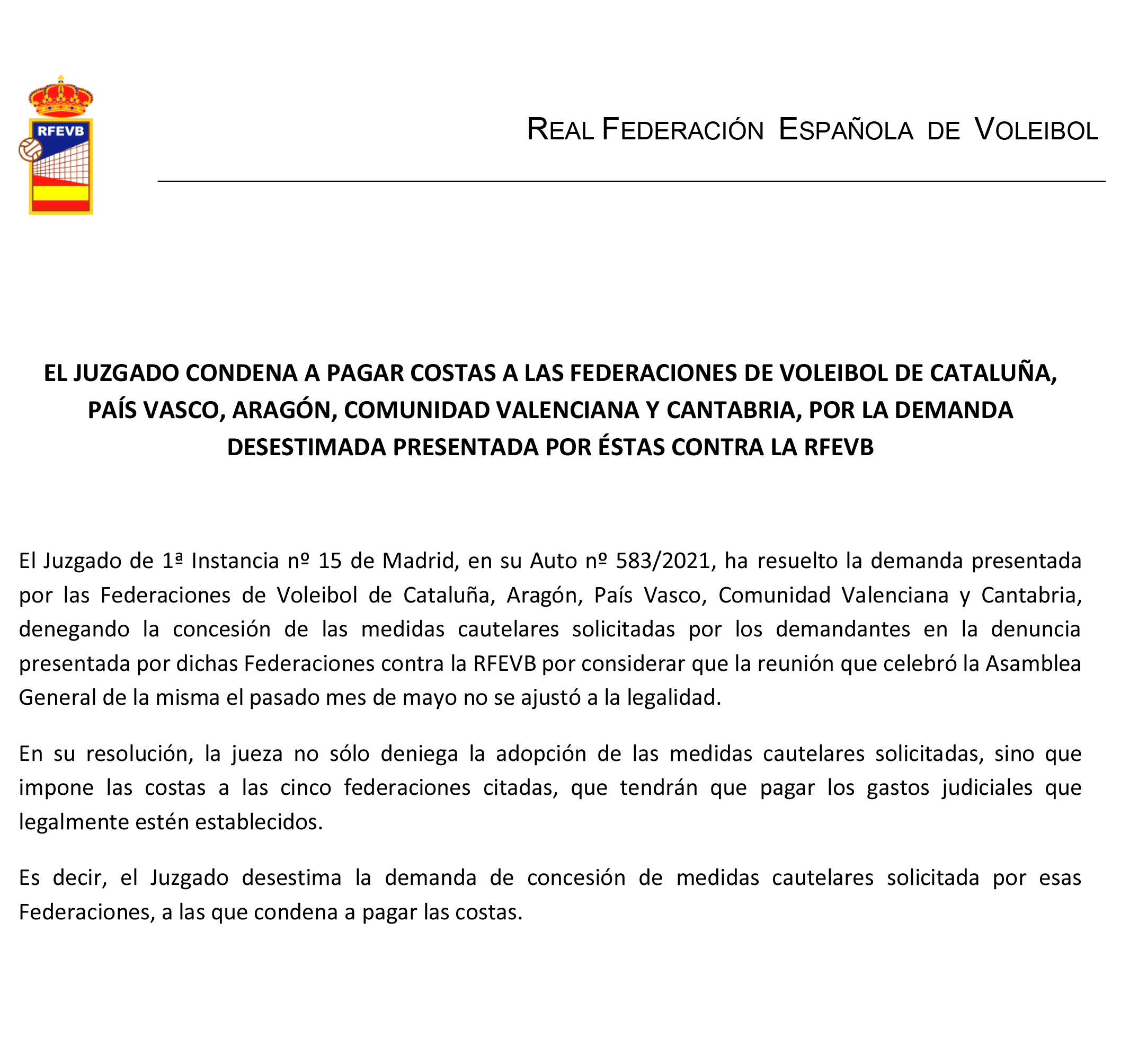 El Juzgado de 1ª Instancia nº 15 de Madrid, en su Auto nº 583/2021, ha resuelto la demanda presentada por las Federaciones de Voleibol de Cataluña, Aragón, País Vasco, Comunidad Valenciana y Cantabria, denegando la concesión de las medidas cautelares solicitadas por los demandantes en la denuncia presentada por dichas Federaciones contra la RFEVB por considerar que la reunión que celebró la Asamblea General de la misma el pasado mes de mayo no se ajustó a la legalidad.