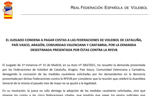 EL JUZGADO CONDENA A PAGAR COSTAS A LAS FEDERACIONES DE VOLEIBOL DE CATALUÑA, PAÍS VASCO, ARAGÓN, COMUNIDAD VALENCIANA Y CANTABRIA, POR LA DEMANDA DESESTIMADA PRESENTADA POR ÉSTAS CONTRA LA RFEVB