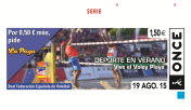 La colección "Deporte en Verano" contará con un total de 88 millones de cupones que llevarán, de lunes a jueves, deportes que se practican en el mar, en la playa, en la montaña, en polideportivos o en el aire, una serie que según el propio organismo, busca concienciar de los beneficios de la práctica deportiva durante el tiempo libre. "Es una serie positiva, vistosa, colorista, que hará las delicias de quienes practican deporte y de los coleccionistas de cupones de la ONCE", afirma el organismo en un comunicado. La serie arranca el día 3 de agosto y concluirá el día 27 de agosto. El ejemplar dedicado al voley playa, de una bella factura y que muestra un instante de la acción del Madison Beach Volley Tour de la pasada temporada ante unas gradas repletas, ha sido realizado en colaboración con la RFEVB y saldrá el 19 de agosto.