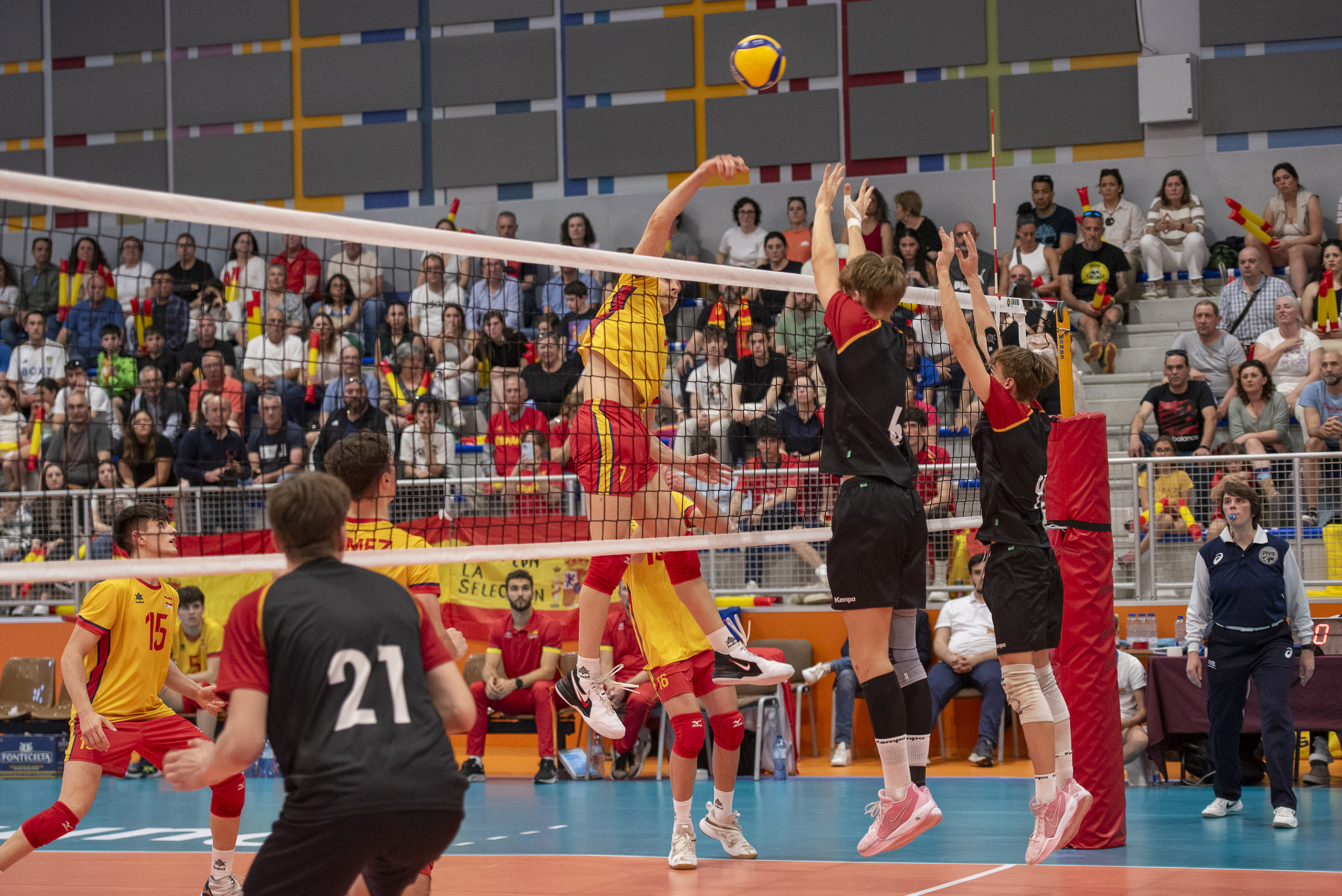 España se medía con Alemania en un duelo decisivo. El triunfo permitía al conjunto de Fredinson Mosquera asegurar su presencia en el Campeonato de Europa, tras el triunfo previo de Ucrania sobre Países Bajos. Los jugadores españoles llevaron la delantera en el marcador de O Conco en todo momento. Pequeñas rentas generadas gracias a un eficaz ataque, donde brillaban las acciones de César Irache, para evitar los intentos germanos de sumar el primer set. España administraba su mínima renta para cerrar el parcial por 22-25