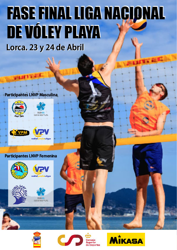 Entre los días 23 y 24 de abril, el Centro Internacional de Vóley Playa de Lorca albergará las fases finales masculina y femenina de la Liga Nacional de Vóley Playa, una nueva competición nacional que arrancaba el pasado mes de enero. Este fin de semana uno de los cuatro equipos finalistas en cada una de las categorías se alzará campeón de la primera edición de este evento deportivo del voleibol sobre arena.