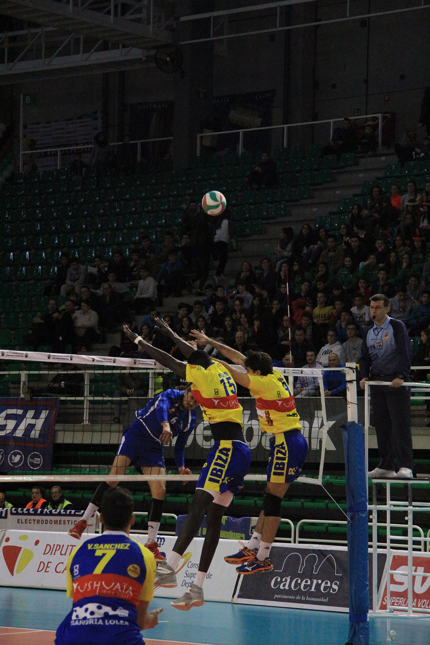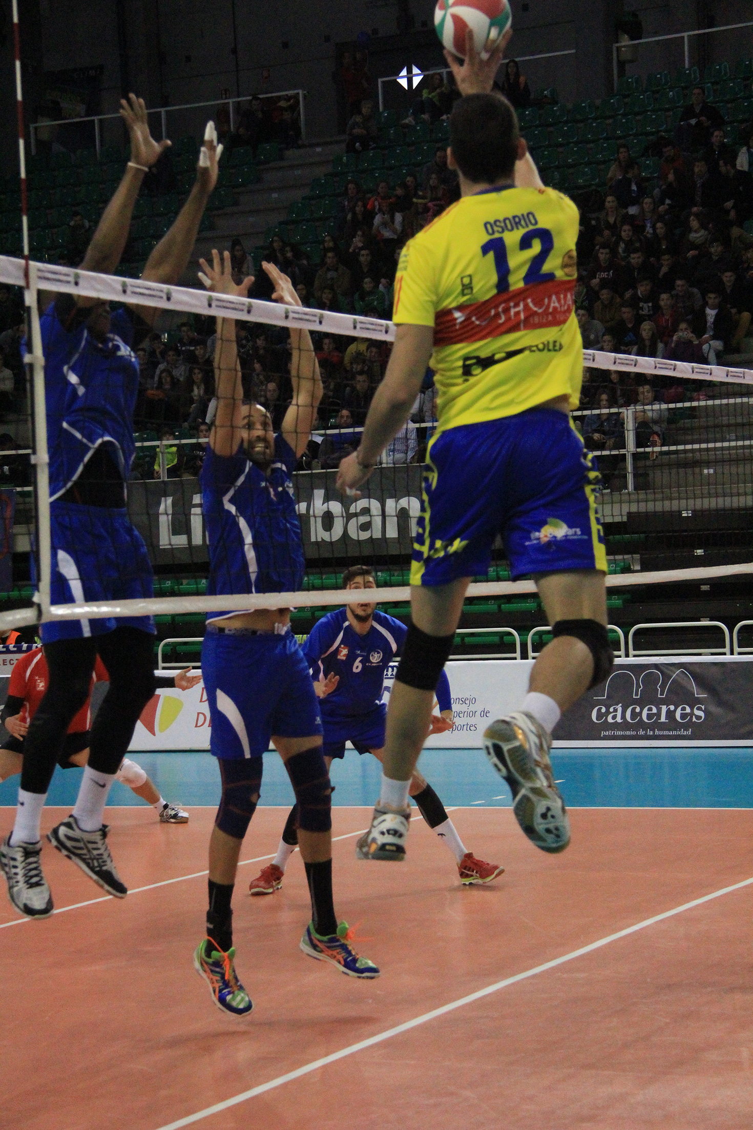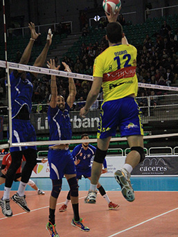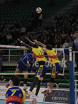 CV Melilla - Ushuaïa Ibiza Vóley Gerard Osorio finta sobre el bloqueo melillense