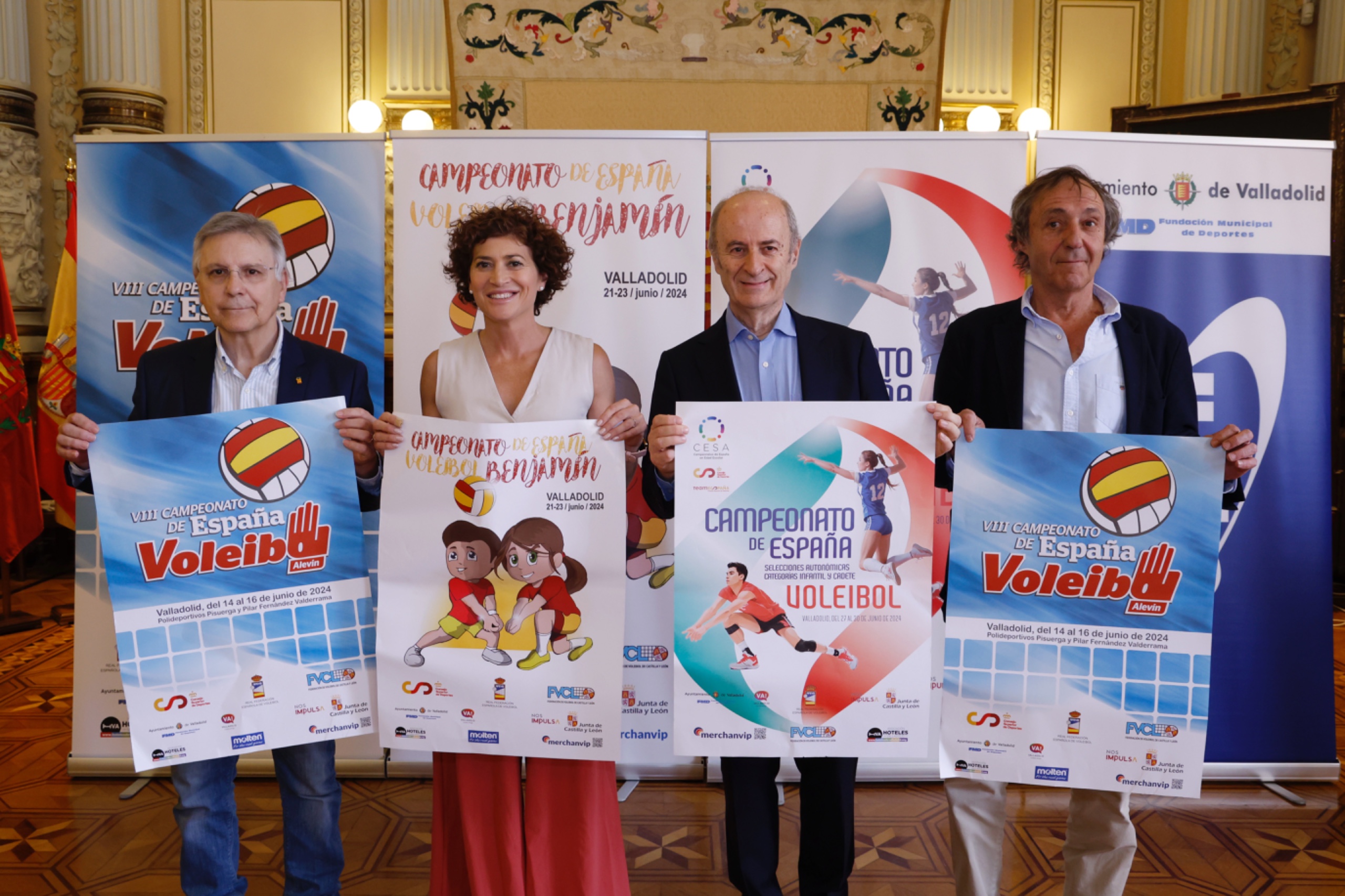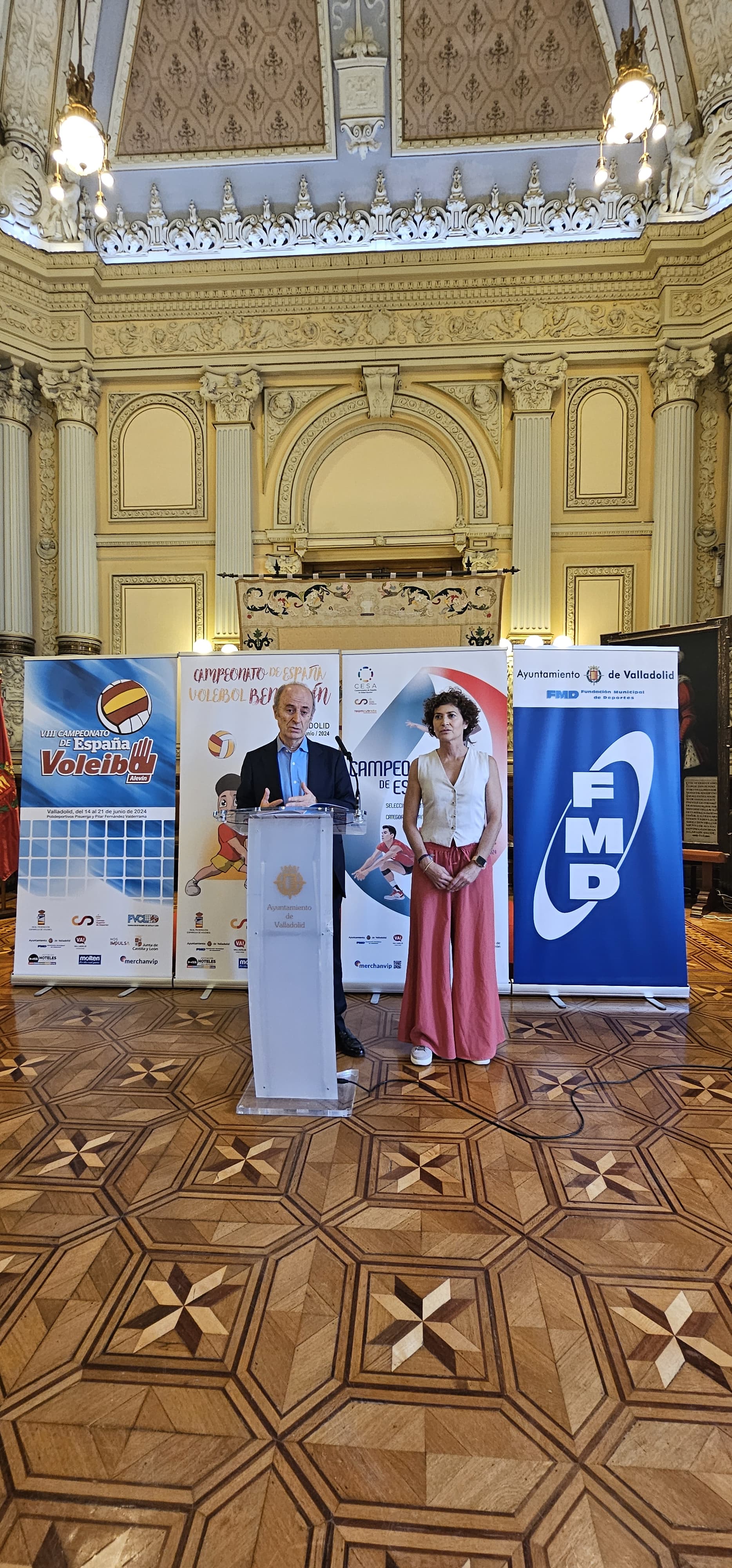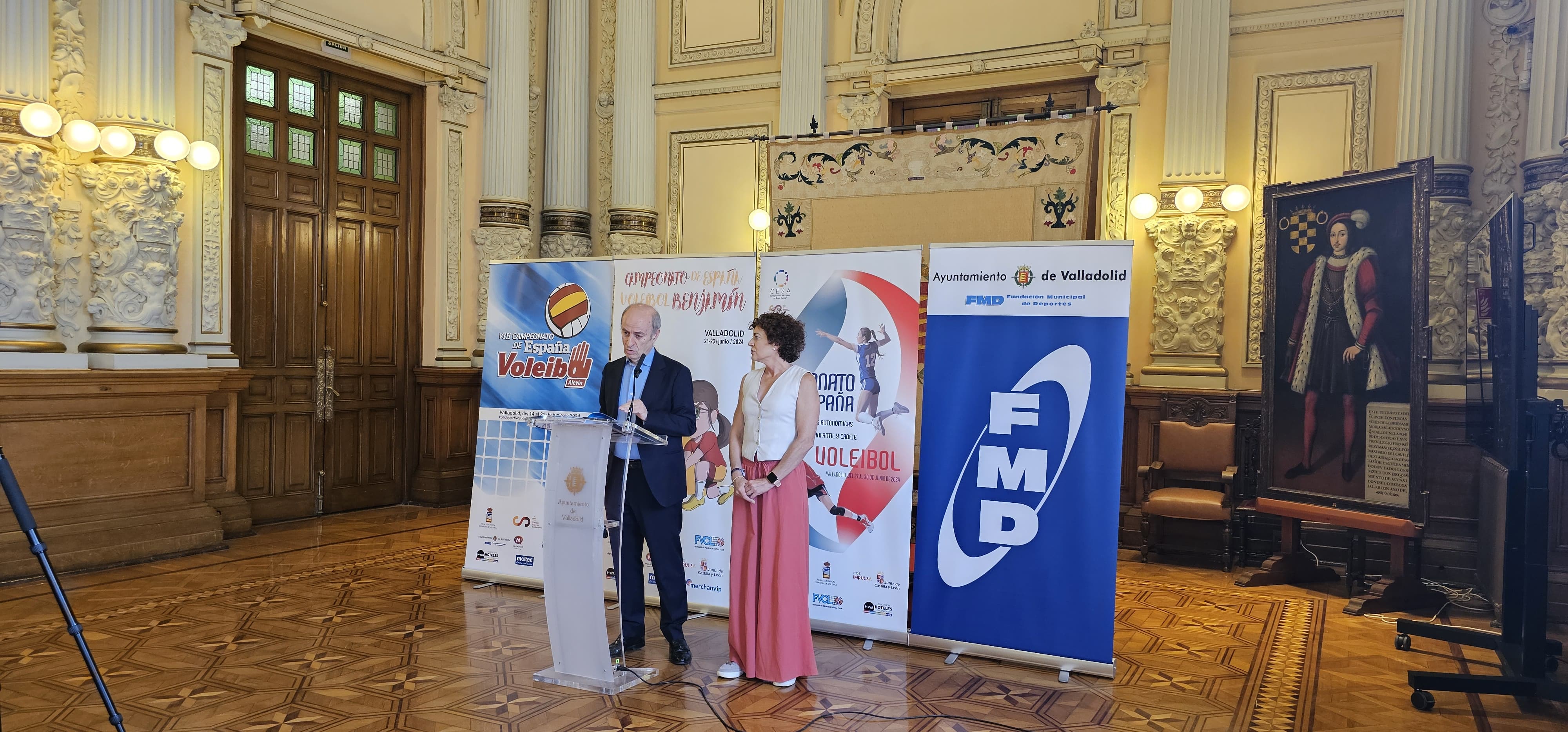 La concejala de Participación Ciudadana y Deportes, Mayte Martínez, junto al presidente de la Real Federación Española de Voleibol, Agustín Martín Santos, han presentado hoy en el Salón de Recepciones del Ayuntamiento los tres campeonatos nacionales que se desarrollarán en Valladolid durante el mes de junio: el VIII Campeonato de España Alevín, el III Campeonato de España Benjamín y el Campeonato de España de Selecciones Autonómicas Infantil y Cadete.